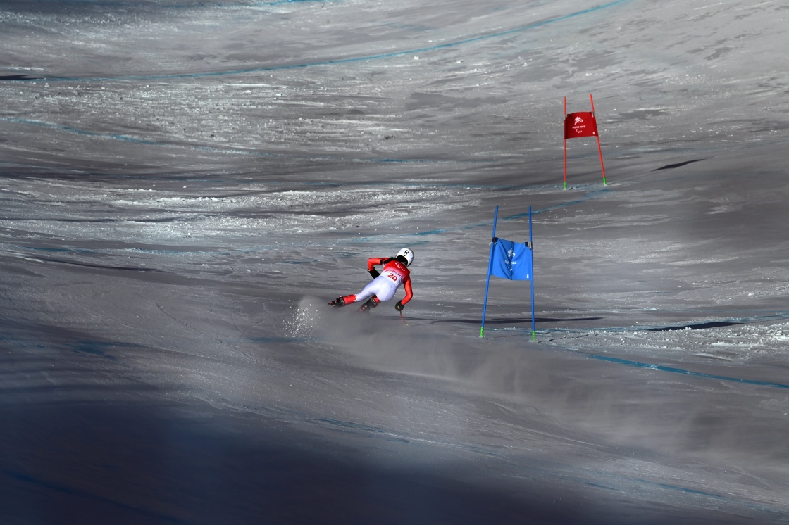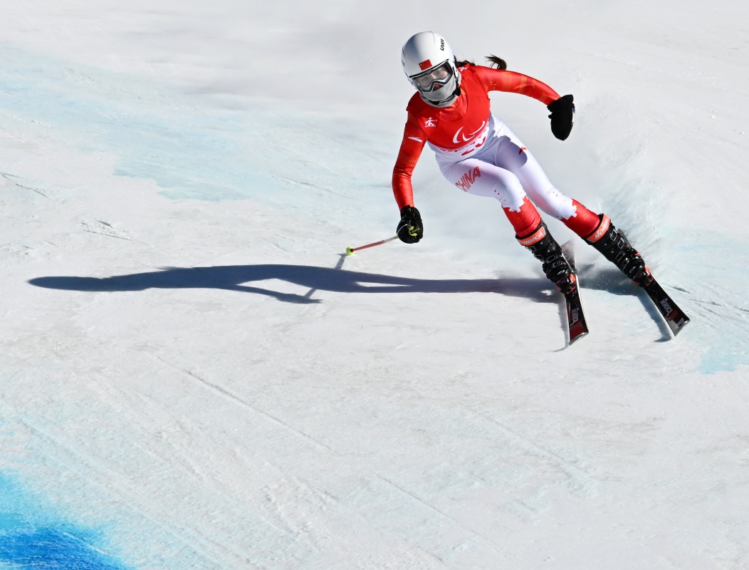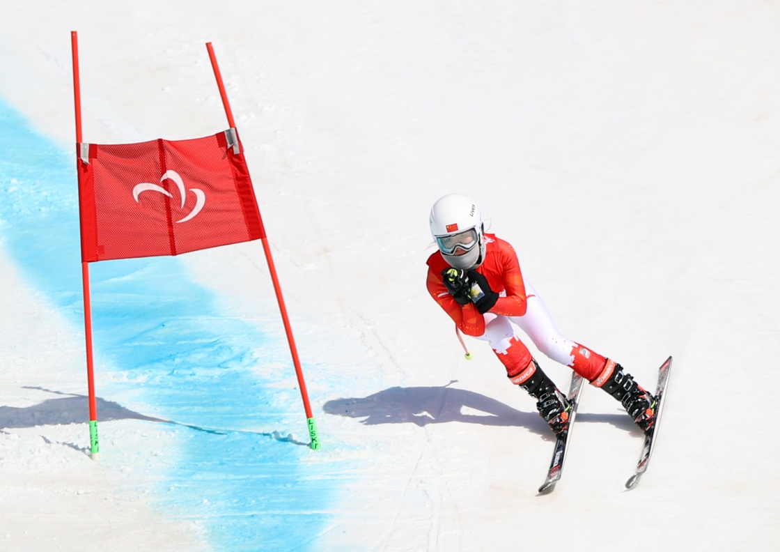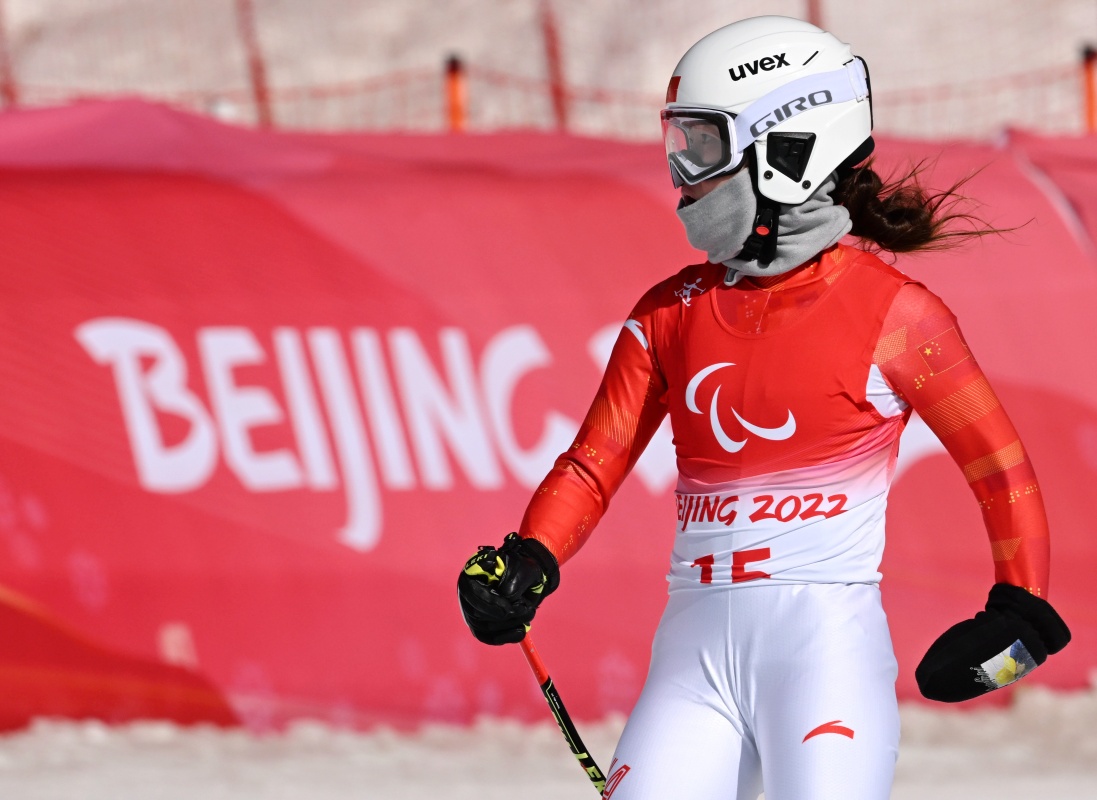 3月7日,張夢秋在北京2022年冬殘奧會殘奧高山滑雪女子全能(站姿)比賽中,她獲得該項目亞軍。新華社記者 江漢 攝