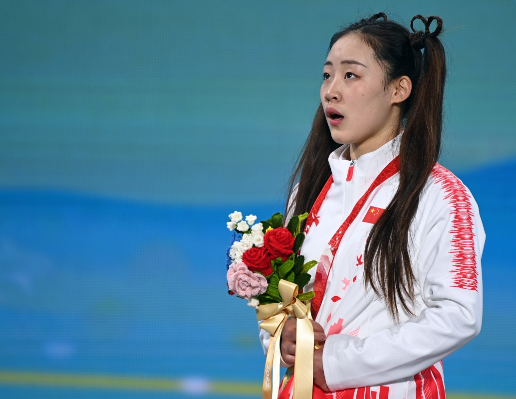 3月6日,獲得冠軍的張夢秋在北京2022年冬殘奧會殘奧高山滑雪女子超級大回轉(zhuǎn)(站姿)比賽獎牌頒發(fā)儀式上唱國歌。新華社記者 李嘉南 攝