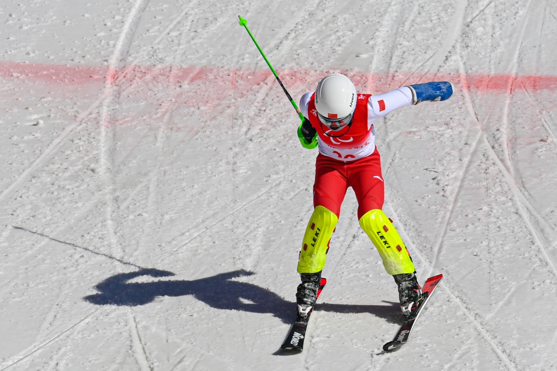 3月7日,張夢秋在北京2022年冬殘奧會殘奧高山滑雪女子全能(站姿)比賽中沖過終點線,她獲得該項目亞軍。新華社記者 江漢 攝