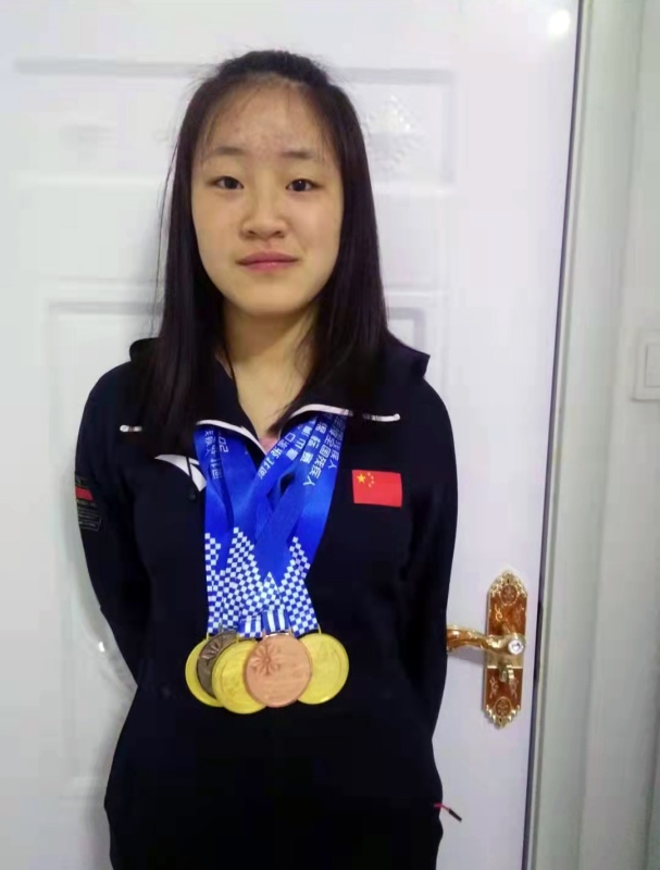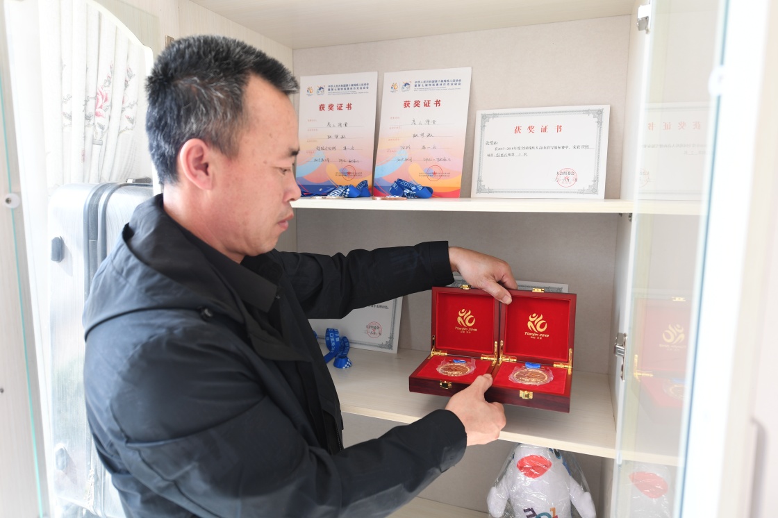 這是2019年4月,張夢秋在家中展示歷次比賽取得的獎牌。新華社發(fā)(受訪者供圖)