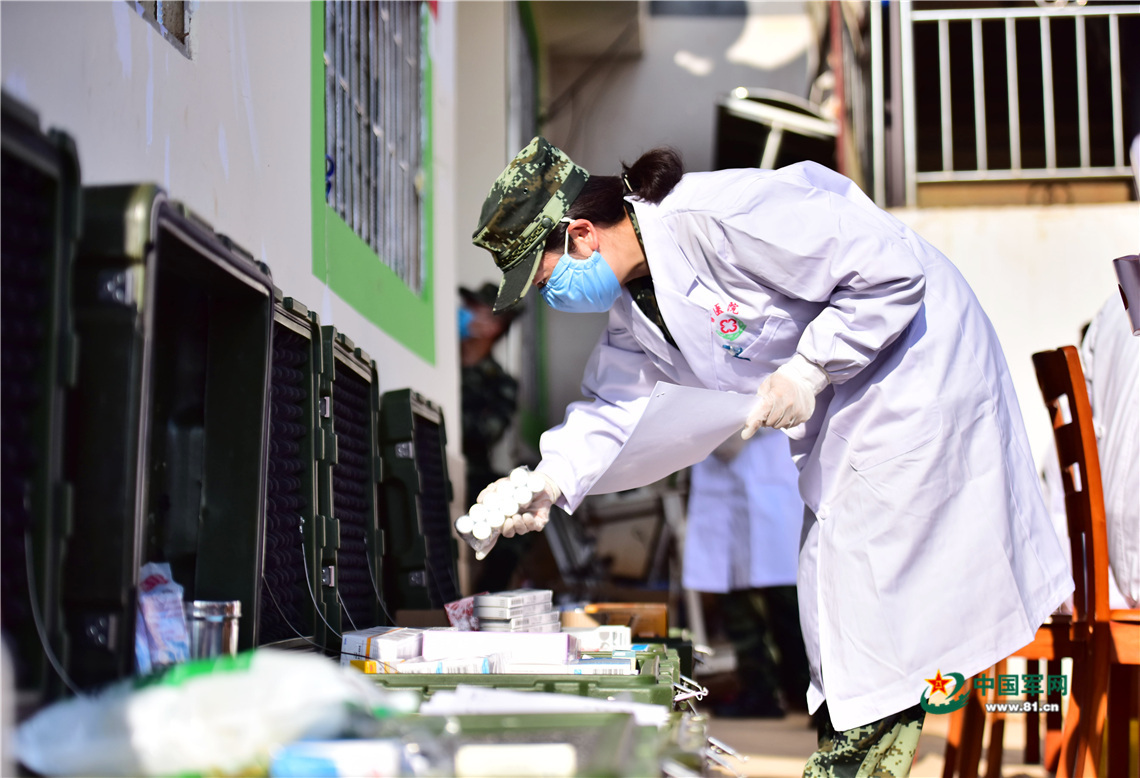 一名軍醫(yī)在為前來就診的老百姓選取藥品。任貴攝