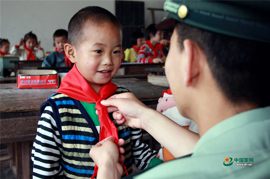 2012年5月,武警官兵在桑植縣汨湖鄉(xiāng)國營農(nóng)墾小學(xué)給同學(xué)們系上新的紅領(lǐng)巾。