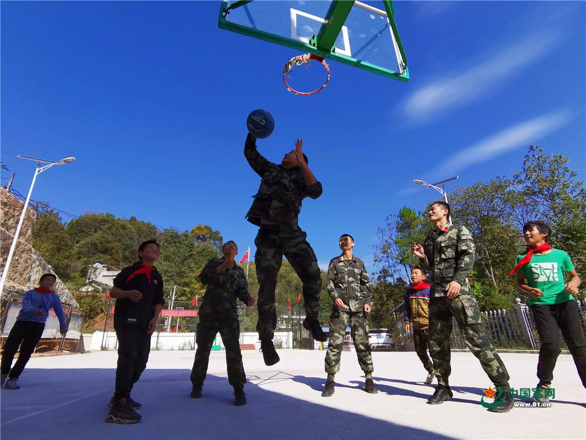 武警官兵在桑植縣空殼樹(shù)鄉(xiāng)蓮花臺(tái)村與孩子們一同籃球比賽。