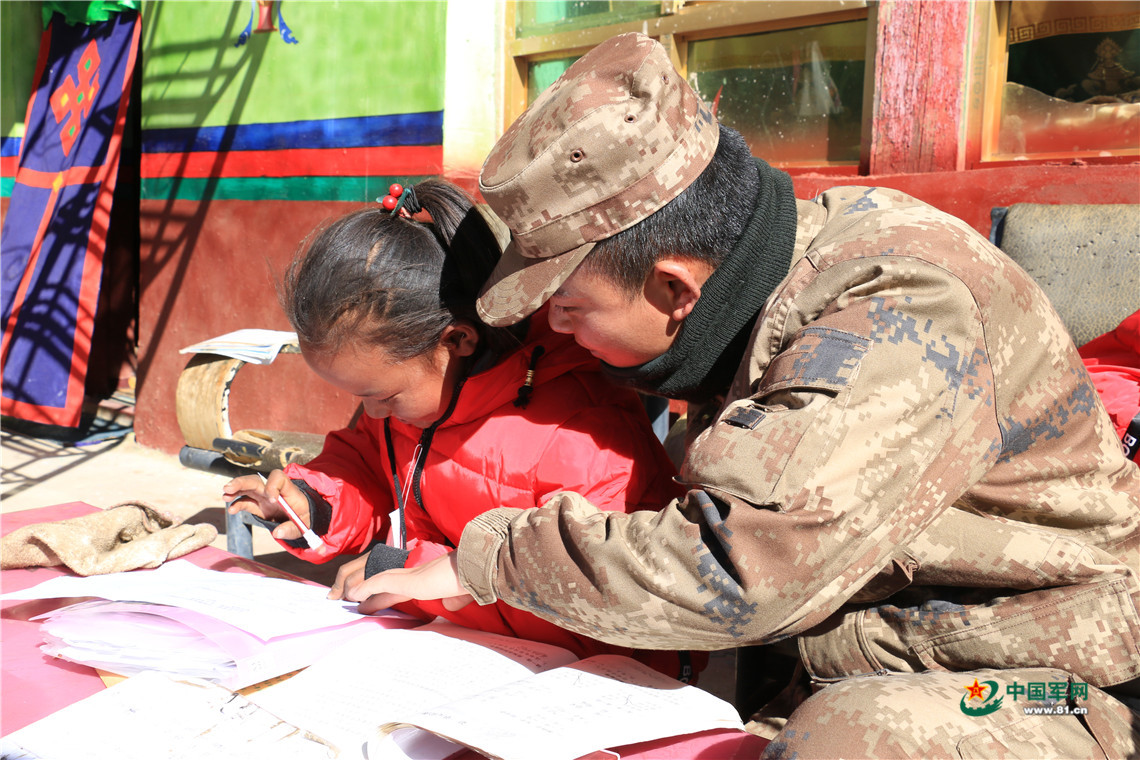 官兵為貧困學(xué)子輔導(dǎo)家庭作業(yè)。肖揚(yáng) 攝