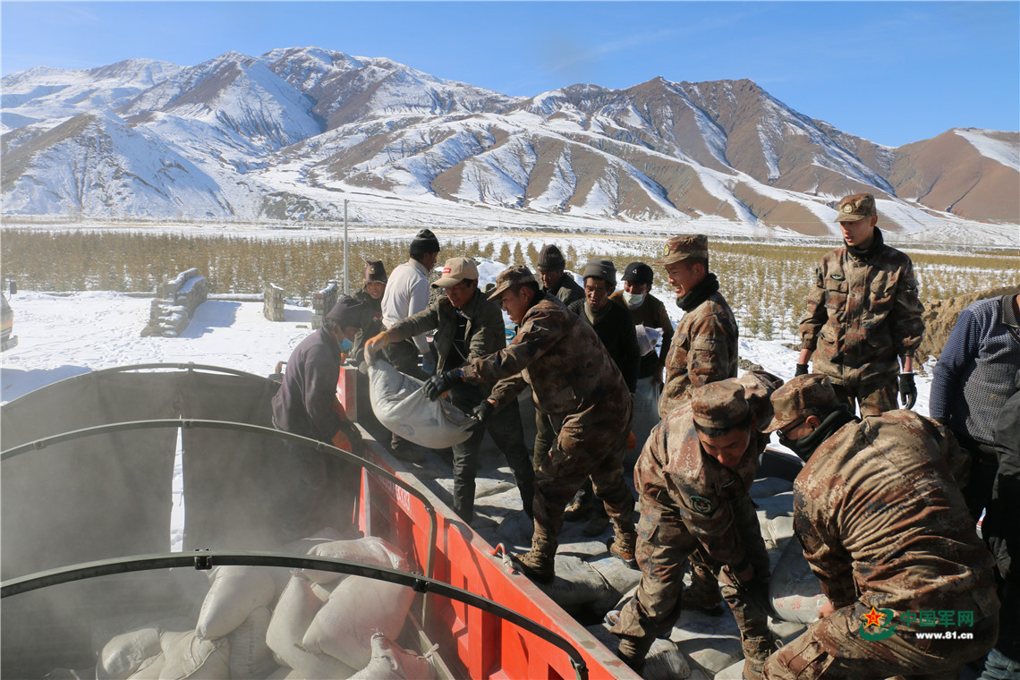 官兵為普夏村貧困戶建設(shè)雅青?,敳仉u養(yǎng)殖基地送去建材。肖揚(yáng) 攝