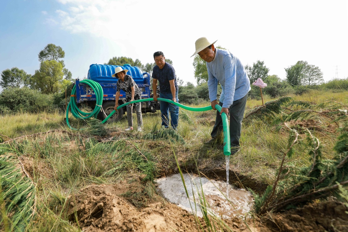 張連印(右)與老伴王秀蘭、兒子張曉斌在山西大同左云縣張家場(chǎng)鄉(xiāng)北梁山坡一起澆水(8月16日攝)。新華社發(fā)(丁美寧 攝)