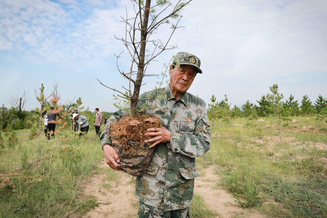 張連印在山西大同左云縣張家場(chǎng)鄉(xiāng)北梁山坡種樹(shù)時(shí)搬運(yùn)樹(shù)苗(7月16日攝)。新華社發(fā)(丁美寧 攝)