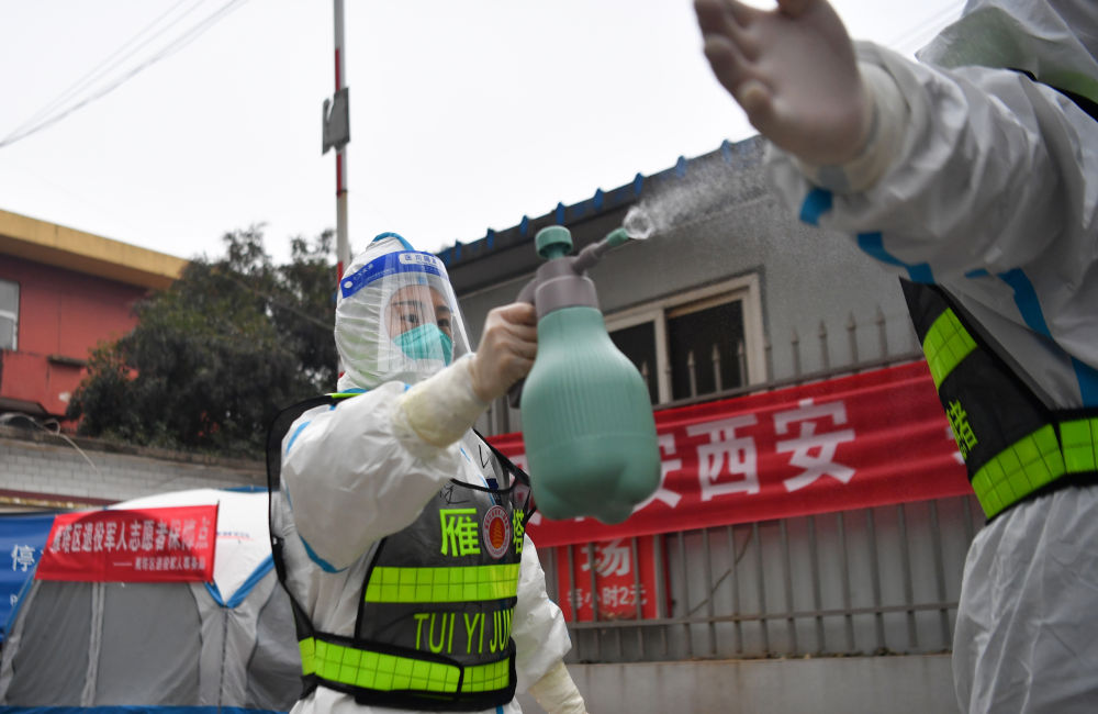 ↑1月7日,西安市雁塔區(qū)退役軍人志愿突擊隊(duì)隊(duì)員位娜娜協(xié)助隊(duì)友為防護(hù)服消毒。