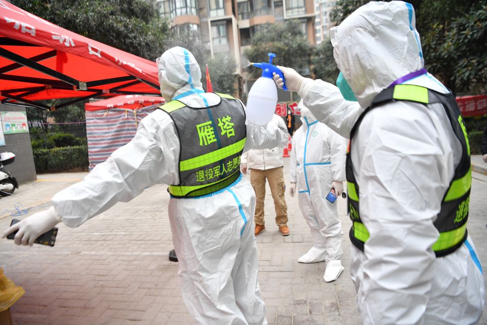 ↑1月7日,西安市雁塔區(qū)退役軍人志愿突擊隊隊員在一處核酸檢測點互相協(xié)助為防護(hù)服消毒。