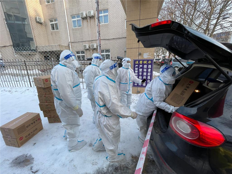 遼寧省葫蘆島市綏中縣農(nóng)電小區(qū)的防疫人員在搬運為小區(qū)居民準(zhǔn)備的湯圓。(新華社記者李昂攝)