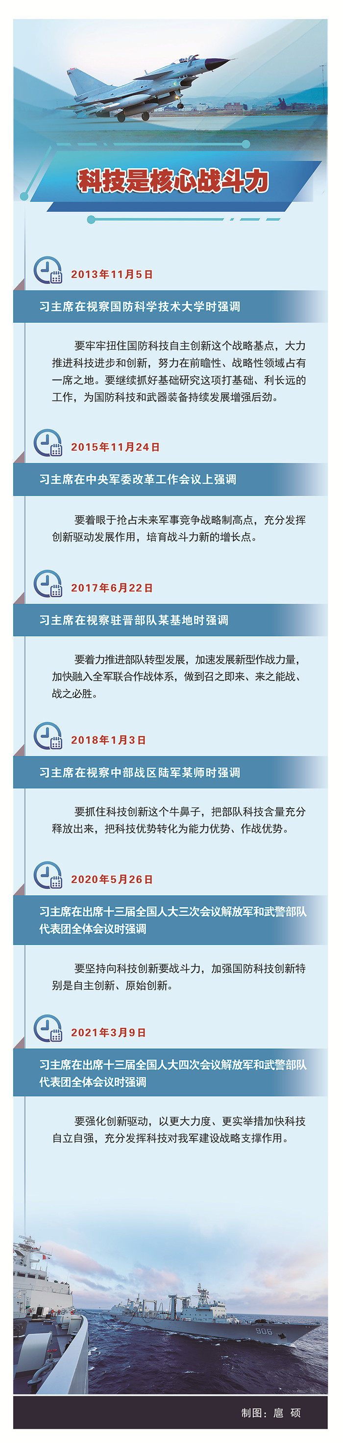 近年來(lái),國(guó)防科技有力支撐重大武器裝備研制發(fā)展,首艘國(guó)產(chǎn)航母下水,新一代戰(zhàn)斗機(jī)殲-20正式服役。我國(guó)科技實(shí)力正在從量的積累邁向質(zhì)的飛躍、從點(diǎn)的突破邁向系統(tǒng)能力提升,科技創(chuàng)新取得新的歷史性成就。實(shí)踐證明,我國(guó)自主創(chuàng)新事業(yè)是大有可為的,我國(guó)廣大科技工作者是大有作為的。