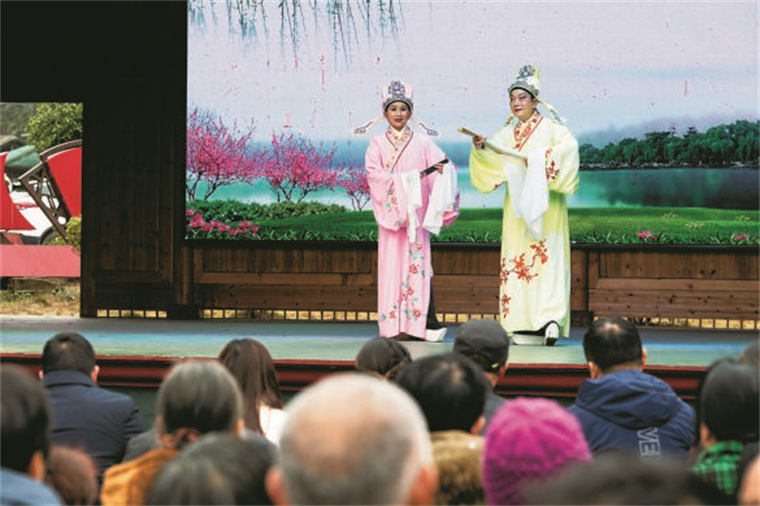 ▲2月1 5日,在鼎城區(qū)黃土店鎮(zhèn)云峰山村,杜美霜(左)和搭檔給當(dāng)?shù)卮迕駧?lái)“戲曲進(jìn)萬(wàn)村”惠民演出。