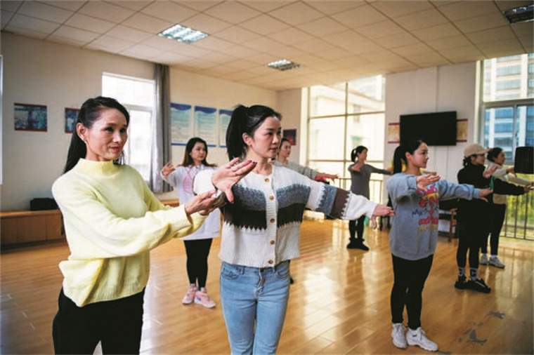 ▲2月1 5日,杜美霜(左一)在常德市鼎城區(qū)花鼓戲保護(hù)中心給青年演員排練節(jié)目。