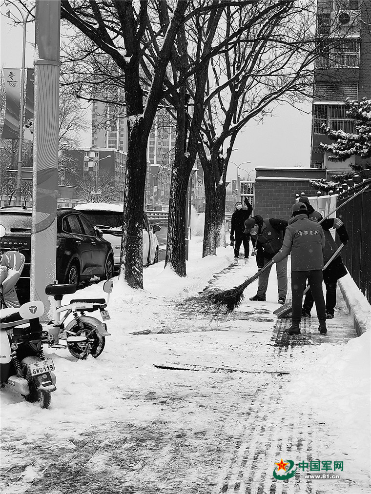 一大清早,延慶區(qū)138支“首都老兵”志愿服務(wù)隊的1800余名志愿者迅即行動,掃雪鏟冰。大家頂風冒雪,用掃帚掃、用鐵鍬鏟,連續(xù)奮戰(zhàn)3小時,將路面冰雪清理干凈,保障延慶賽區(qū)賽事交通順暢。