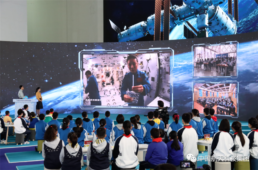 地面主課堂中國科技館內(nèi)的學(xué)生通過視頻通話與航天員進(jìn)行互動(dòng)交流。