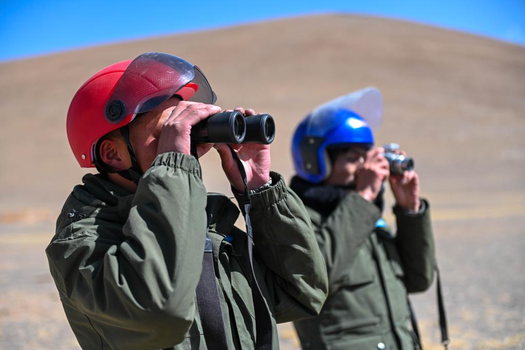 洛桑日達(dá)(左)與隊友正在觀察野生動物。新華社記者周荻瀟 攝