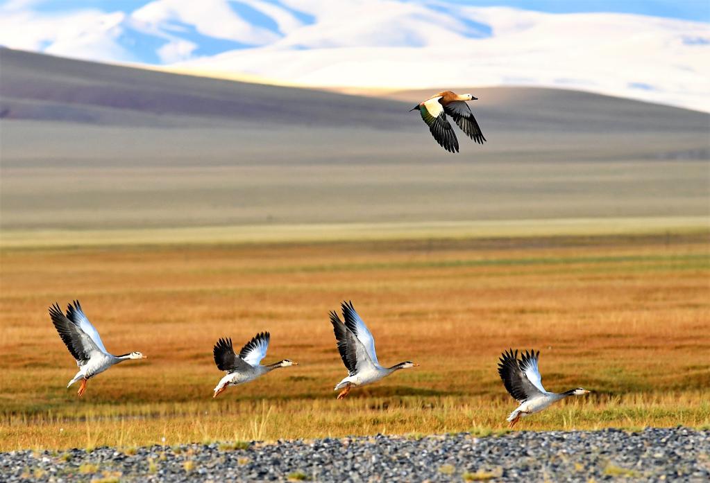 一只赤麻鴨(上)和一群斑頭雁在保護(hù)區(qū)尼瑪縣那若塘濕地上飛翔。新華社記者張汝鋒 攝