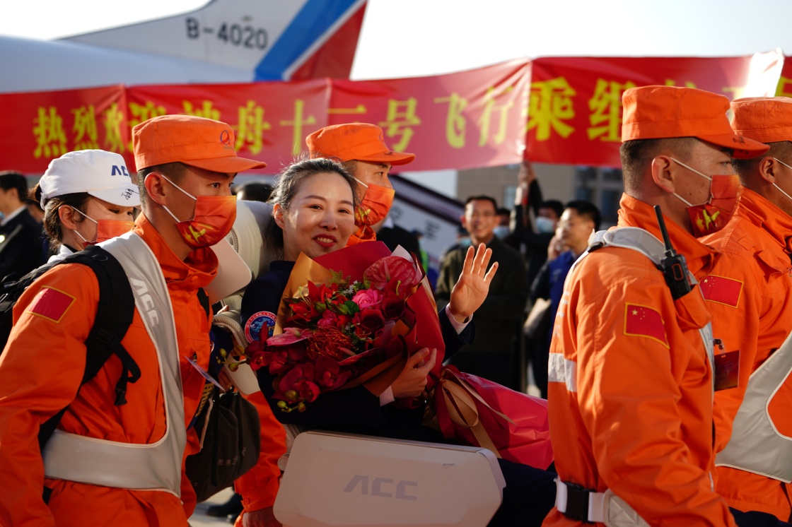 4月16日,神舟十三號(hào)航天員乘組平安抵京,航天員王亞平向歡迎人群揮手致意。新華社記者 田定宇 攝