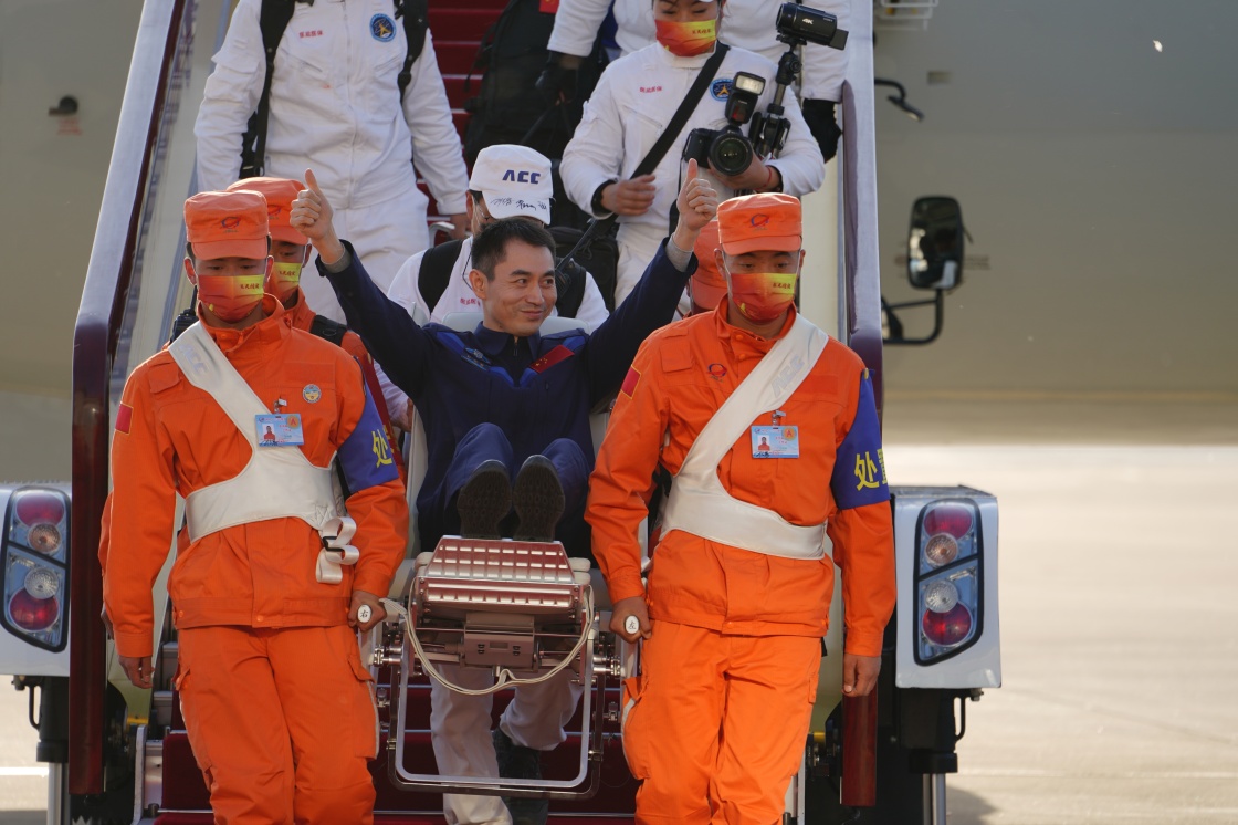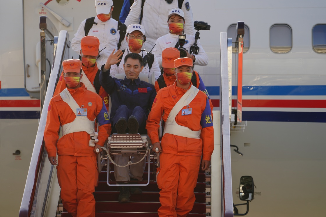 4月16日,神舟十三號(hào)航天員乘組平安抵京,航天員葉光富向歡迎人群致意。新華社記者 田定宇 攝