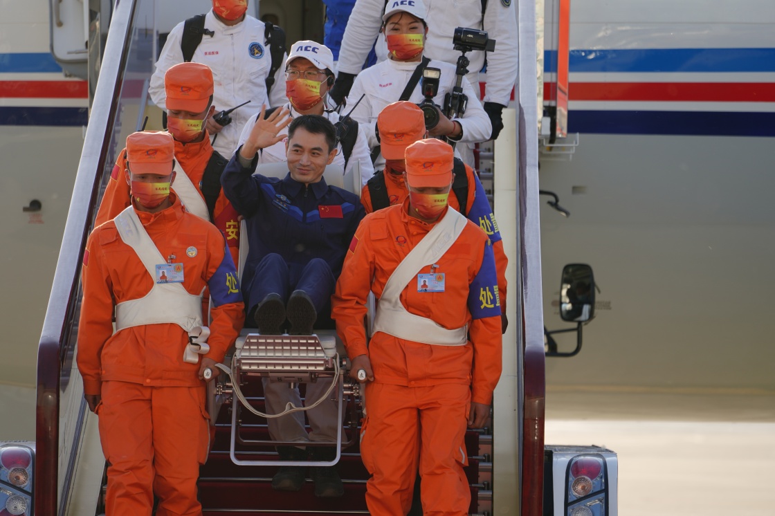 4月16日,神舟十三號(hào)航天員乘組平安抵京,航天員翟志剛向歡迎人群揮手致意。新華社記者 田定宇 攝