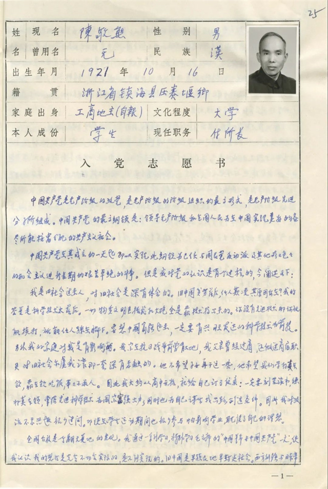 在對(duì)國(guó)防科技事業(yè)不斷探索、取得成績(jī)的同時(shí),陳敬熊還積極向黨組織靠攏。從1954年第一次遞交入黨申請(qǐng)書到1979年加入中國(guó)共產(chǎn)黨,25年的入黨路,他時(shí)時(shí)刻刻以黨員的標(biāo)準(zhǔn)嚴(yán)格要求自己,堅(jiān)持科技救國(guó)信念、堅(jiān)定科技報(bào)國(guó)初心。