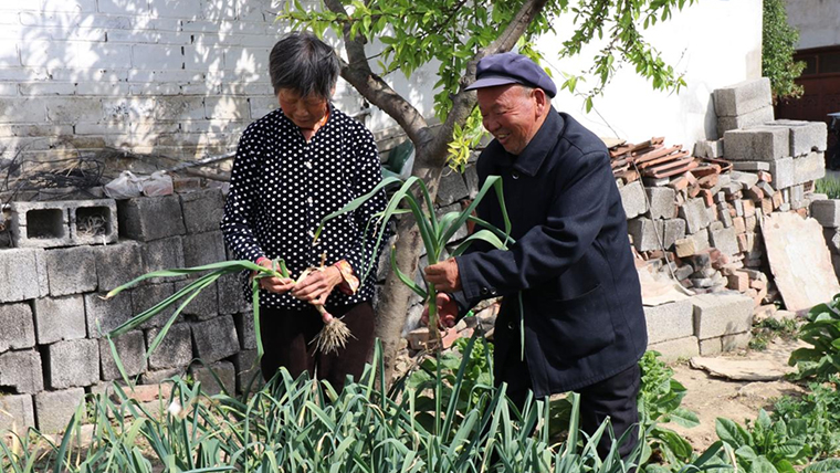 韓君生(右)與老伴在家里的小菜園勞動。