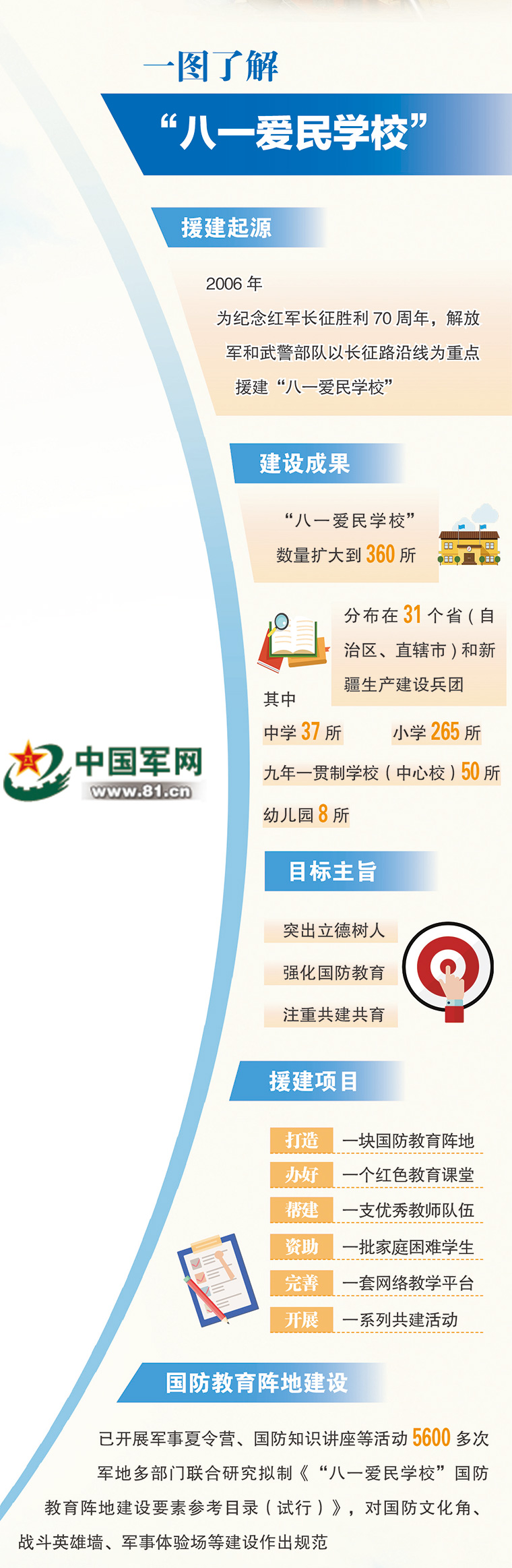 2006年,為紀(jì)念紅軍長征勝利70周年,解放軍和武警部隊(duì)決定沿著長征路援建“八一愛民學(xué)校”。起初擬定援建計(jì)劃為70所,實(shí)際援建中,結(jié)合地方需要,不少部隊(duì)在原定援建任務(wù)的基礎(chǔ)上增加了援建數(shù)量,使援建學(xué)校達(dá)到112所。黨的十八大以來,全軍部隊(duì)貫徹習(xí)主席關(guān)于軍隊(duì)參加和支援經(jīng)濟(jì)社會建設(shè)重要決策指示,繼續(xù)增加“八一愛民學(xué)?!痹〝?shù)量,截至今年3月,已擴(kuò)大到360所。