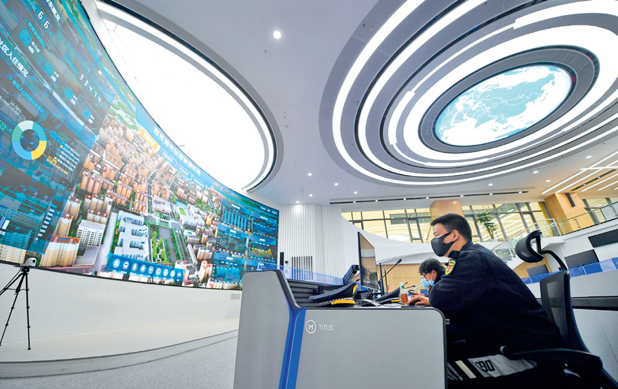 工作人員在雄安新區(qū)容東城市運(yùn)營(yíng)管理中心監(jiān)管平臺(tái)工作(2022年3月29日攝) 朱旭東攝/本刊