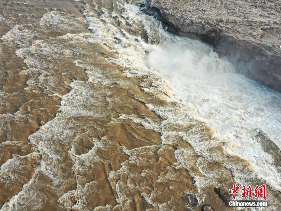 位于秦晉峽谷段的黃河水量減少,河水明顯變清,十里龍槽水位下降,壺口瀑布落差加大,滔滔白浪飛流直下,濺起沖天水霧,壺口瀑布出現(xiàn)“青山綠水”景觀。蘭華 攝