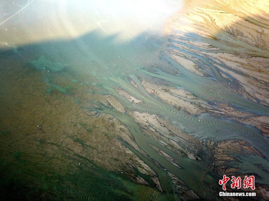 河南濟(jì)源小浪底水庫(kù)黃河三峽段,河底底部紋路明暗相間,酷似樹(shù)影交錯(cuò),成群的水鳥(niǎo)在“枝頭”翔集,美似一副天然油畫。 王中舉 攝