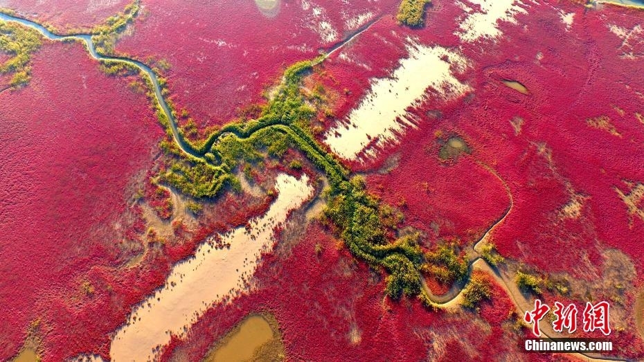 “黃河入海蘊(yùn)奇觀,百鳥(niǎo)翔游水云間,紅毯迎賓畫漫卷,蘆花飛雪落九天”,是山東東營(yíng)黃河入??诘纳鷦?dòng)寫照。楊斌 攝