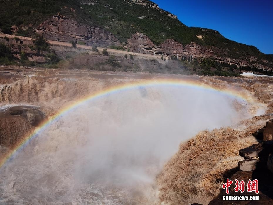 秋高氣爽,山西黃河壺口瀑布出現(xiàn)彩虹通天美景。此時(shí)的壺口瀑布水流量在1600立方米左右,主、副瀑布連成一片,氣勢(shì)磅礴,景色壯美。從空中俯瞰,只見(jiàn)洶涌澎湃的黃河水奔流而下,落入十里龍漕,激起陣陣水霧,形成水底冒煙、谷澗起雷、群龍戲浪、彩虹通天等奇特景觀。張輝 攝