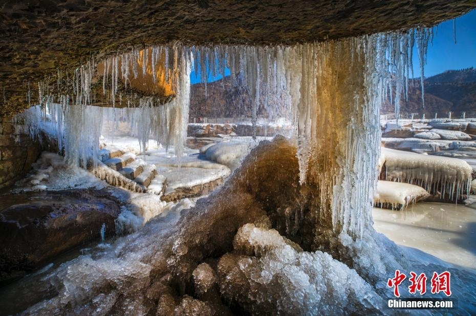 陜西黃河壺口瀑布水流湍急,巨浪翻滾,濺起巨大水霧騰空而起。瀑布兩岸冰凌素裹,冰峰倒掛,晶瑩剔透。 蘭華 攝