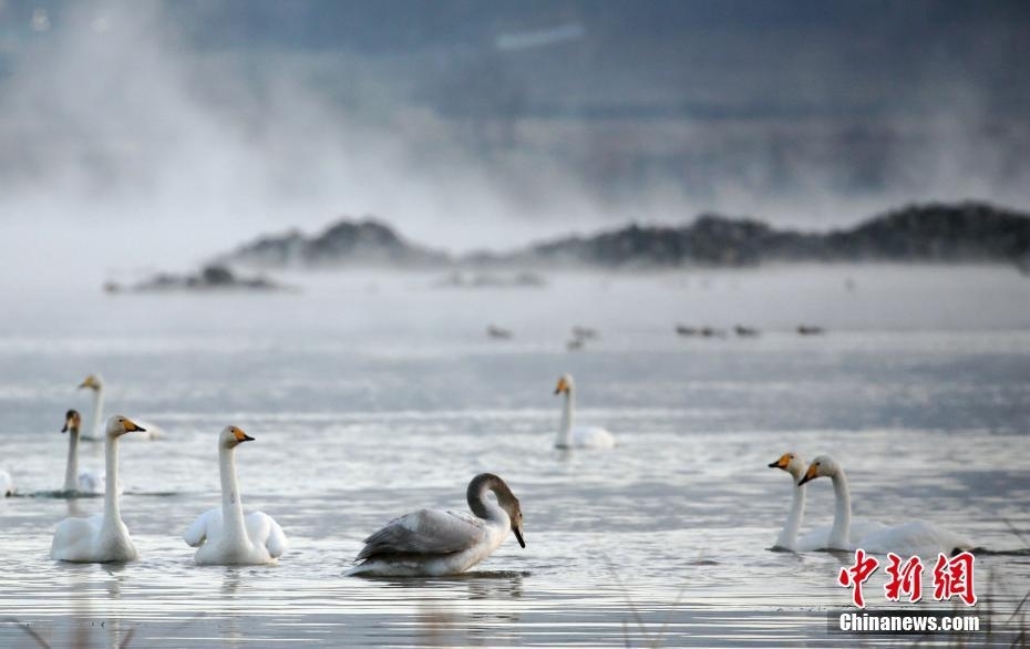 一群大天鵝飛臨青海省海東市化隆縣群科鎮(zhèn)黃河岸畔,或悠閑嬉戲,或四處張望,并與遠(yuǎn)岸樹(shù)木及河面薄霧構(gòu)成一幅山水畫卷。李玉峰 攝