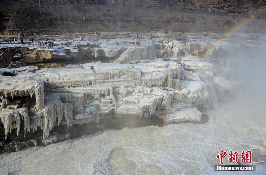 受強(qiáng)降溫天氣影響,黃河壺口瀑布形成冰掛景觀,晶瑩剔透的冰掛與瀑布上空彩虹交相輝映,景色迷人,吸引了眾多游客。張建良 攝
