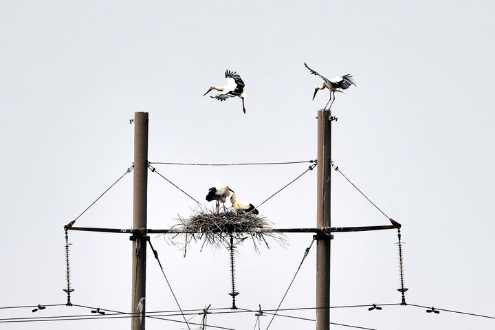這是山東黃河三角洲國家級自然保護區(qū)電線桿上的東方白鸛的巢(2021年5月13日攝)。新華社記者 郭緒雷 攝