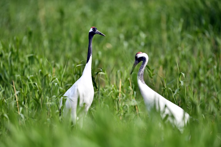 在山東黃河三角洲國家級自然保護區(qū),丹頂鶴在水草間棲息(2021年5月13日攝)。新華社記者 郭緒雷 攝
