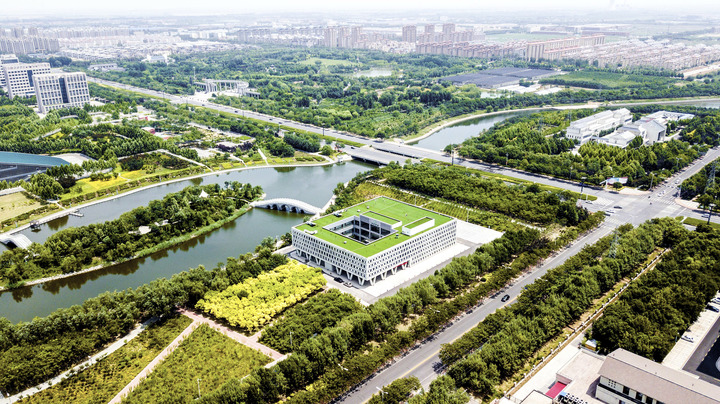 這是2018年6月24日拍攝的山東省東營市墾利區(qū)城市景色(無人機照片)。新華社記者 吳剛 攝