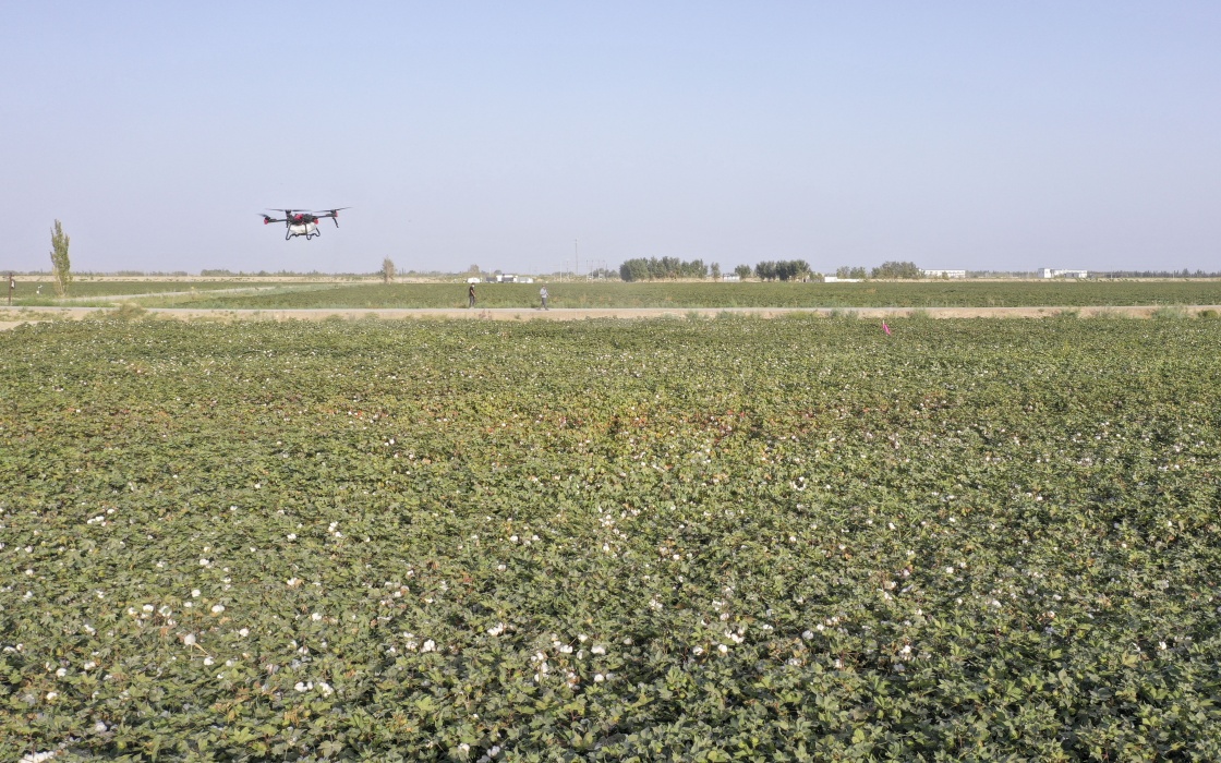 在新疆尉犁縣興平鎮(zhèn)達(dá)西村一處高標(biāo)準(zhǔn)農(nóng)田,種植戶(hù)用無(wú)人機(jī)噴灑脫葉劑(2022年9月20日攝,無(wú)人機(jī)照片)。