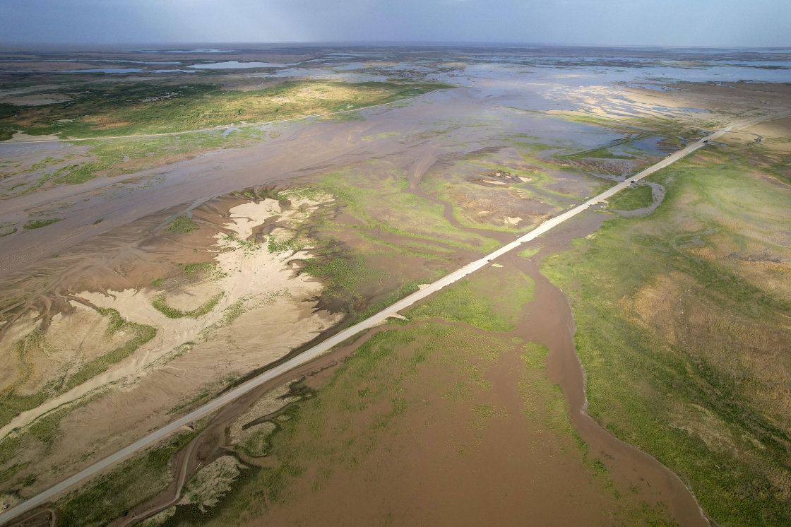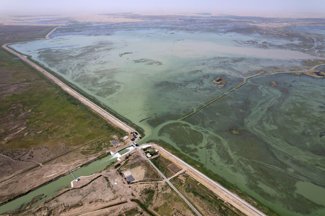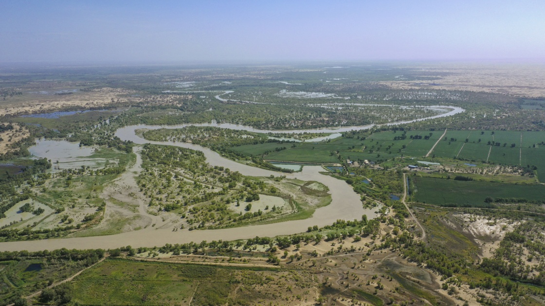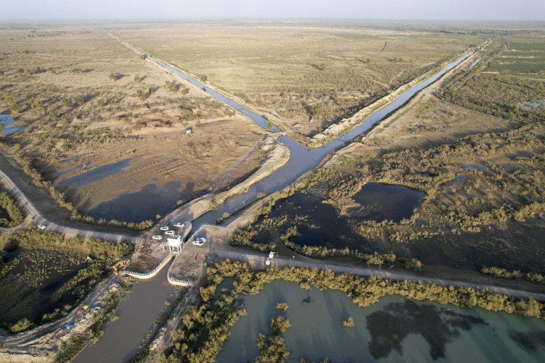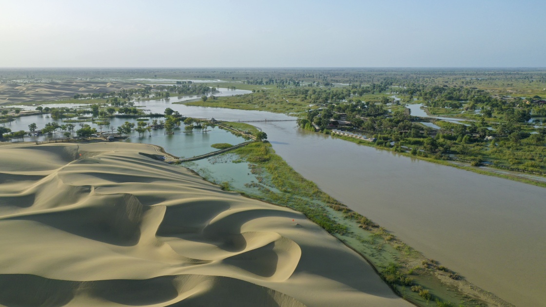 從塔里木河上游奔涌而來(lái)的洪水通過(guò)新疆阿克蘇地區(qū)沙雅縣沙德克確了生態(tài)閘,流向不同方向(2022年8月13日攝,無(wú)人機(jī)照片)。