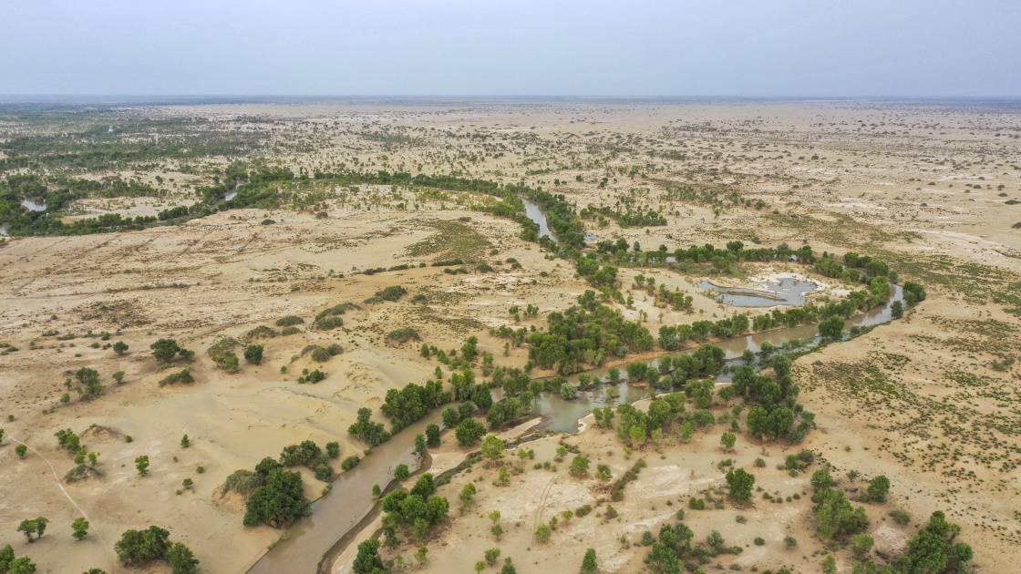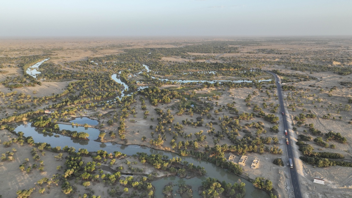 這是2022年6月20日拍攝的新疆尉犁縣墩闊坦鄉(xiāng)托布協(xié)區(qū)域,生態(tài)輸水滋養(yǎng)了植被(無(wú)人機(jī)照片)。