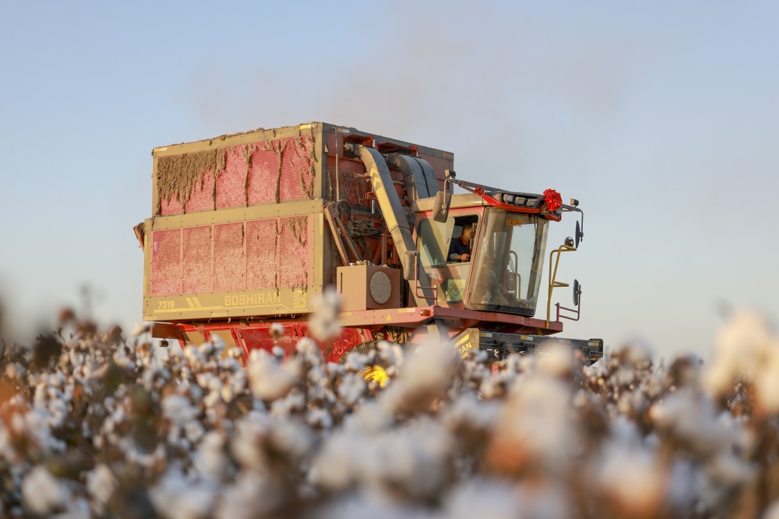 2022年9月26日,新疆阿克蘇地區(qū)沙雅縣塔里木鄉(xiāng)其格格熱木村村民黃清順開(kāi)著新買(mǎi)的采棉機(jī)采收棉花。