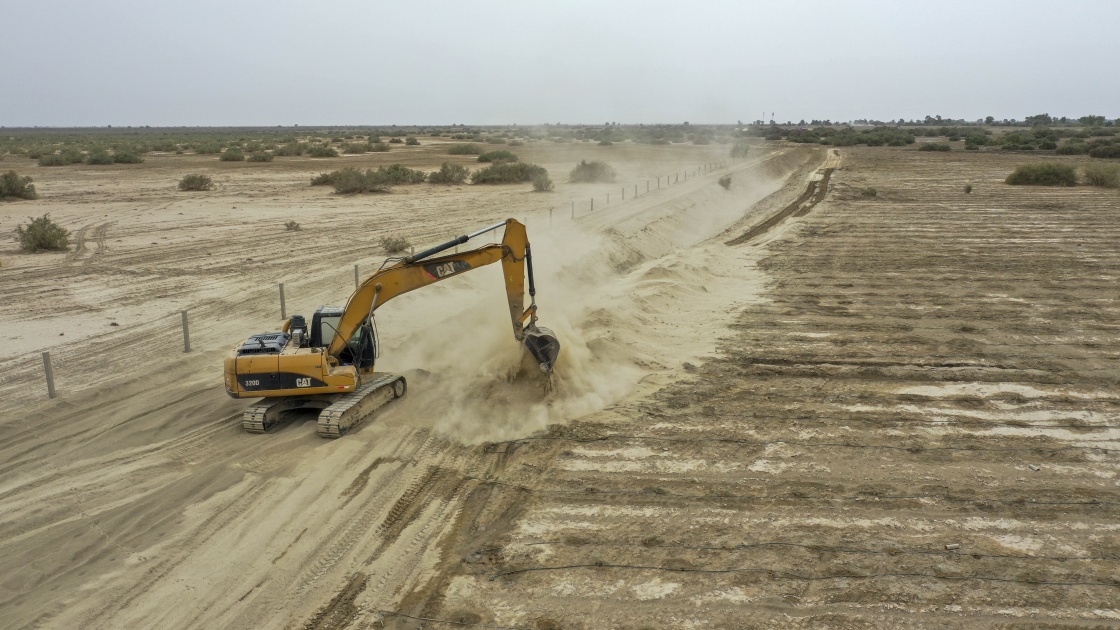 在新疆尉犁縣墩闊坦鄉(xiāng)托布協(xié)區(qū)域的引洪灌溉工程,一臺(tái)挖掘機(jī)在施工(2022年6月20日攝,無(wú)人機(jī)照片)。