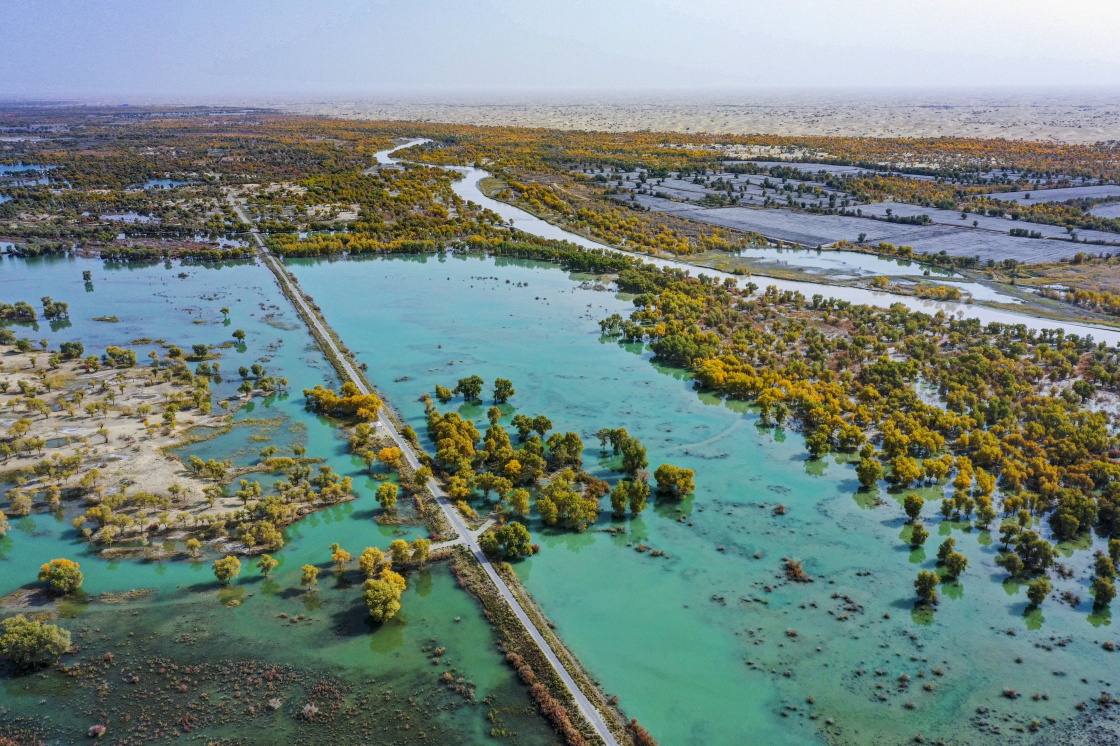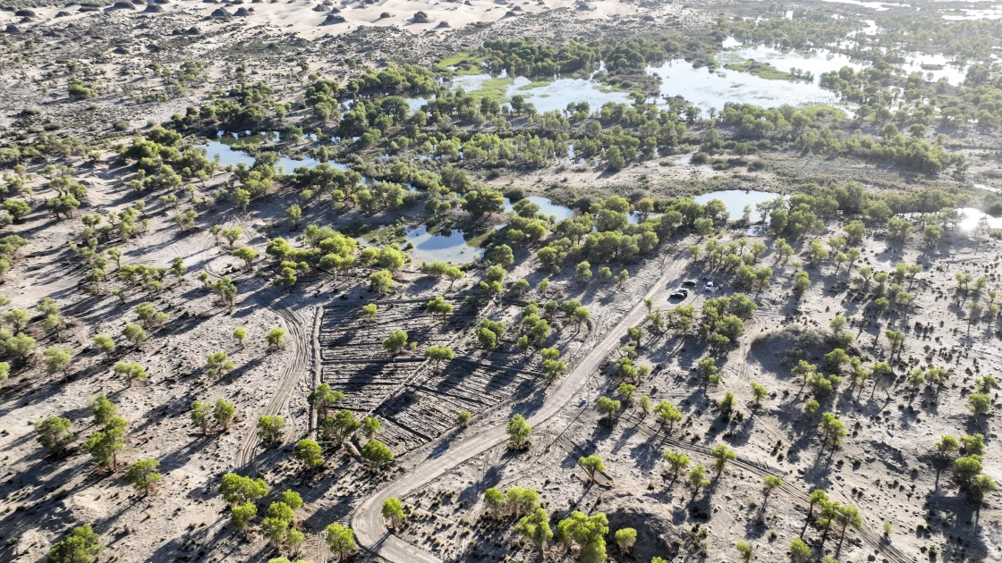 這是2022年8月18日拍攝的塔里木河下游阿拉干斷面景象(無(wú)人機(jī)照片)。生態(tài)水滋潤(rùn)兩岸胡楊等植被,同時(shí)保障交通要道少受風(fēng)沙侵襲。