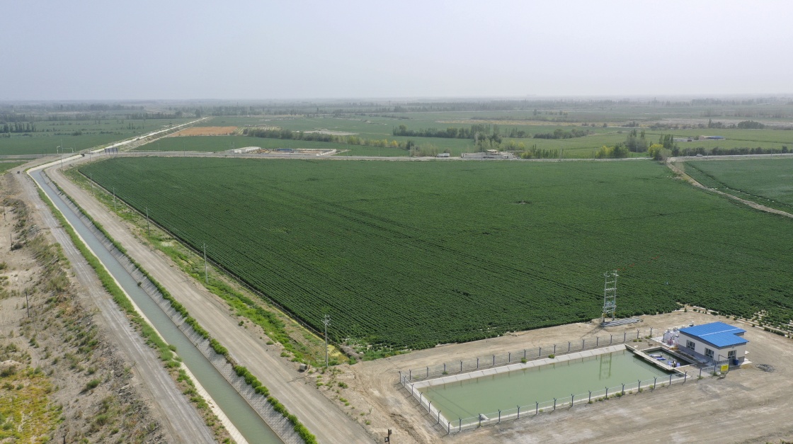 在新疆尉犁縣興平鎮(zhèn)達(dá)西村一處高標(biāo)準(zhǔn)農(nóng)田,棉花進(jìn)入結(jié)鈴期,智能灌溉泵房正在運(yùn)行,對(duì)棉田進(jìn)行無(wú)人化灌溉(2022年8月9日攝,無(wú)人機(jī)照片)。