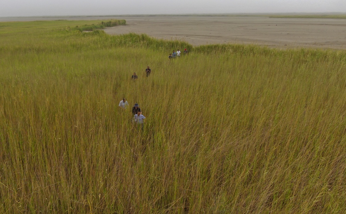 塔里木河流域管理局工作人員在臺(tái)特瑪湖湖區(qū)踏勘(2022年7月20日攝,無(wú)人機(jī)照片)。