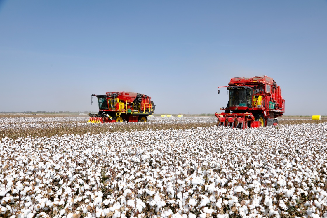 2022年9月30日,兩臺(tái)國(guó)產(chǎn)采棉機(jī)在新疆尉犁縣興平鎮(zhèn)統(tǒng)其克村的棉田里采收棉花。