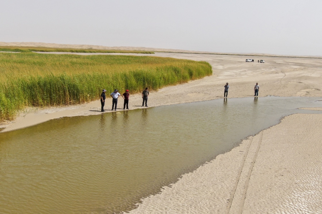 塔里木河流域管理局工作人員在車(chē)爾臣河入湖口查看生態(tài)水進(jìn)入臺(tái)特瑪湖情況(2022年7月28日攝,無(wú)人機(jī)照片)。