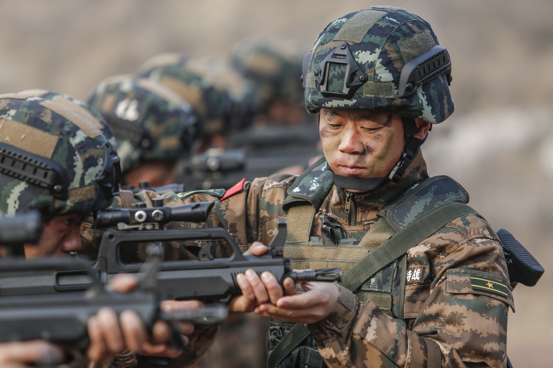 武警河北總隊某部大隊長李闖組織特戰(zhàn)隊員進行據(jù)槍訓(xùn)練(2021年3月4日攝)。新華社發(fā)(張丹 攝)