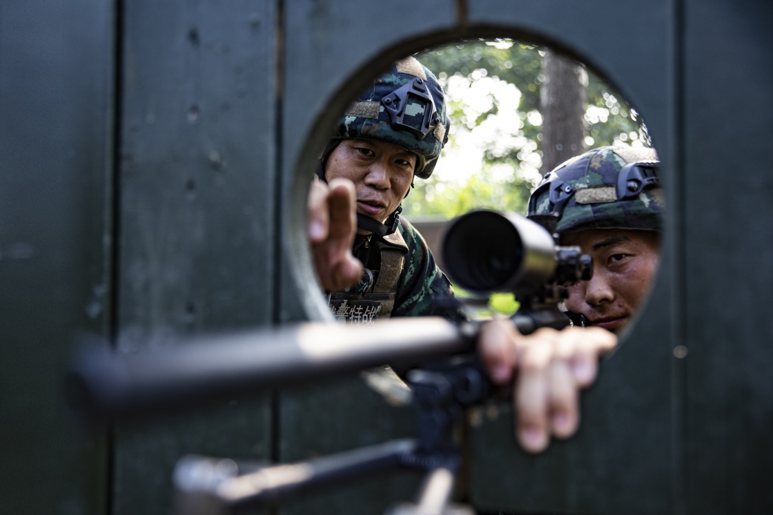 武警河北總隊某部大隊長李闖(左)指導(dǎo)特戰(zhàn)隊員狙擊訓(xùn)練(2022年8月3日攝)。新華社發(fā)(江騰 攝)